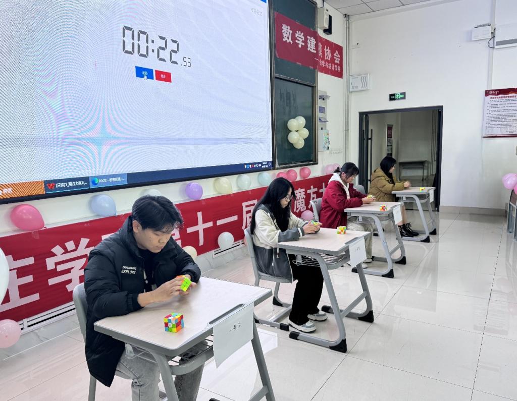 经过初赛选拔,有24位选手进入决赛。决赛采取三阶速拧方式,四人为一组、计时制、速度快者获胜。选手们凭借娴熟的技法、精湛的技巧、敏捷的思维以及高度的专注力,展开了一场速度与智慧的较量。魔方还原的过程,不仅是对选手们动手与动脑能力的检验,更是对心理素质的考验。为活跃气氛,比赛进行期间还穿插有歌曲、古典舞、街舞等节目。经过紧张而又激烈的比赛,文学院选手王丽荣获得一等奖,传媒学院张涵星、旅游与资源环境学院孟椿原分获二等奖,外国语学院岳舒欣、刘诚智,bat365中文官方网站赵聪聪等三人获得三等奖,另有六人获得优秀奖,现场公布成绩并颁发证书和精美礼品。