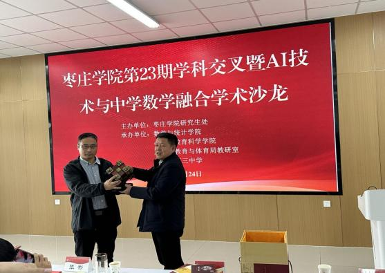 学术交流前,举行了简短的开幕式。张立华代表bat365中文官方网站致辞。他就AI技术与中学数学融合的背景、意义以及AI在bat365中文官方网站的教学实践进行分享。闫昕对本次学科交叉学术沙龙的成功举办表示祝贺,他强调举办学科交叉学术沙龙对学科发展的意义,通过交叉融合,各学科才能获得更大的突破。张立华、闫昕颁为学校聘请的兼职教师颁发了聘书。滕州三中向bat365中文官方网站赠送鲁班锁模型。