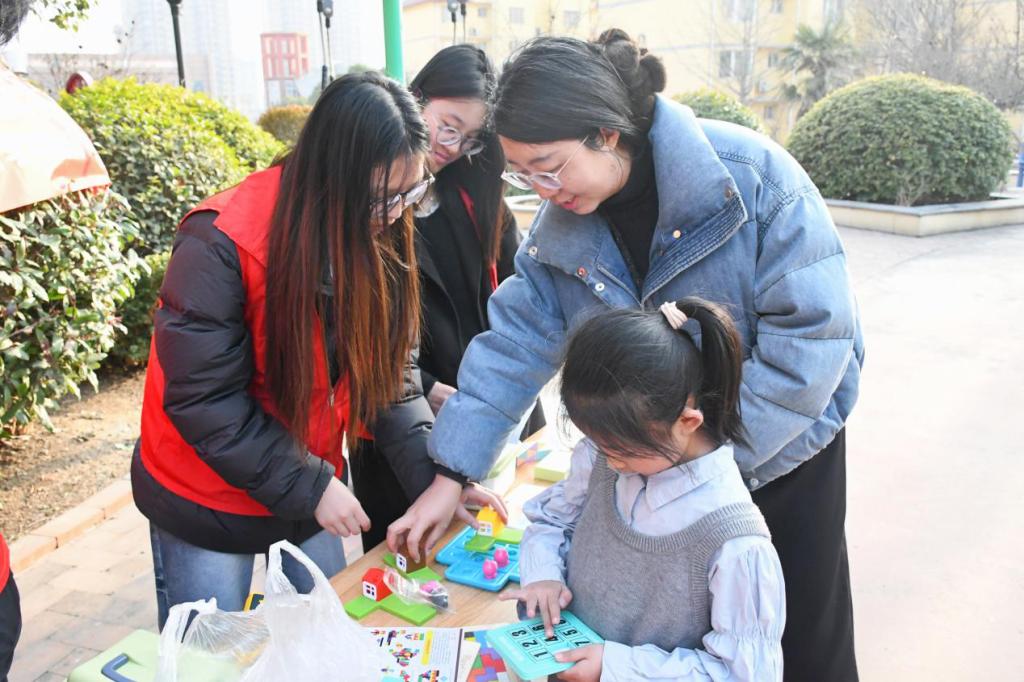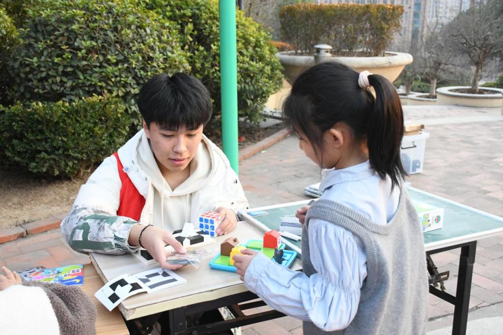 志愿者们通过魔方、华容道、俄罗斯方块、三只小猪桌游等数学思维启智小游戏与小朋友进行亲密互动,小朋友在寓教于乐中感受到了智力游戏的魅力。