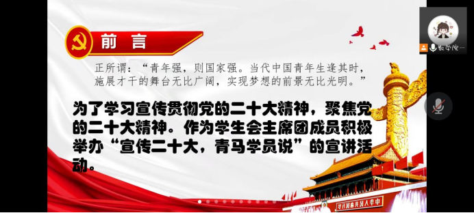此次宣讲内容丰富、形式多样,紧扣主题、寓意深刻。大家爱党爱国、青春奋斗之情寓于生动活泼的宣讲之中,在宣讲过后部分同学还讲述了自己对党的二十大精神的理解,呈现出青年学子热血昂扬、砥砺前行的精神风貌,展示了青年学生走好新时代“赶考路”的信心决心。