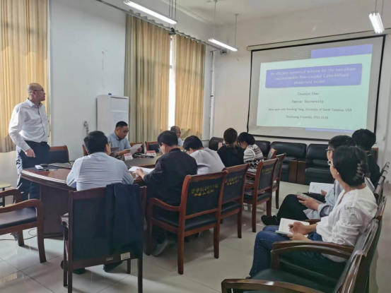 首先陈传军教授做了题为《不可压缩两相流Cahn-Hilliard型相场模型的高效数值格式》的报告,其次,陈传军教授结合自身工作实际,做了题为《科研和科学基金申报经验分享》的报告,最后,针对一流本科课程建设及教学改革中的几点体会做了分享。