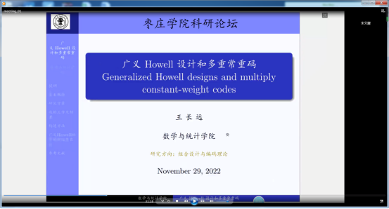 王长远老师作了题为《广义Howell设计和多重常重码》的学术报告。报告中介绍了广义Howell设计和多重常重码的定义、构造、存在性以及它们之间的联系。通过引入不完全广义Howell设计、广义Howell标架设计等辅助设计,建立了广义Howell设计强有力的递归构造方法;推广了经典starter-adder方法;基本完全确定了三类区组长度为3的广义Howell设计的存在性;利用边染色有向完全图分解工具,解决了一类广义Howell标架设计的渐近存在性问题;基于广义Howell设计与一类多重常重码之间的等价性,得到若干类新的重量为5、最小距离为8的最优多重常重码的存在性结果。