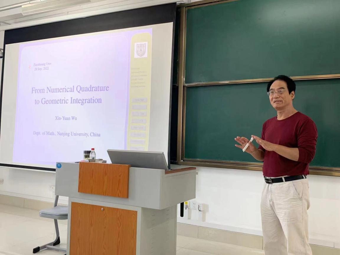 9月28日下午,南京大学数学系吴新元教授应邀为bat365官网教师作主题为“From Numerical Quadrature to Geometric Integration”的学术讲座。数学与统计学院党总支书记王海峰书记、副院长吕长青、计算数学科研团队全体教师和部分专业高年级学生参加会议,王海峰书记主持报告会。