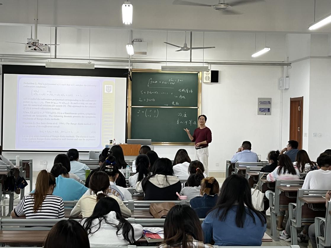 吴新元教授从传统算法开始讲解,内容涵盖能量守恒与辛算法的相当性,数值积分与几何积分的区别,定积分的求积公式在求解微分方程中的应用,结构保持意义上的哈密顿系统的几何数值积分。吴教授生动地介绍了保结构数值方法的研究由中国科学院院士冯康先生创立初期的有趣历史,接着深入浅出地介绍了常数变异公式在常微分方程和偏微分方程精确求解中发挥的重要作用,并举例介绍了常数变异公式的应用推广;由常数变异公式方法,直接推导出了Runge-Kutta方法,与常规Runge-Kutta方法的思路做了比较,之后介绍了RKN方法、指数Runge-Kutta方法的推导和研究进展。