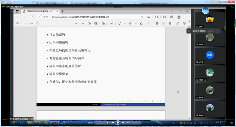 为营造良好的学术氛围,加强教师之间的学术交流,提高教师的科学素养,bat365中文官方网站于2022年5月4日晚,举办了青年学者学术论坛的第一场报告,青年教师鲁学星博士通过腾讯视频会议为学院教师做了题为《因果网络范畴和因果凝聚框架》的专题学术报告。