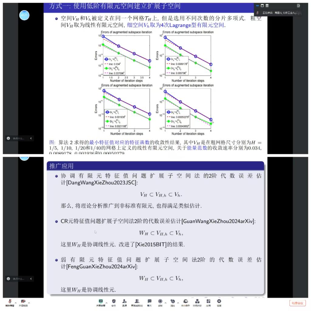报告提出了求解特征值问题的扩展子空间法及其多水平校正法,该方法通过构造一个特殊的扩展子空间,巧妙地将细网格上特征值问题的求解转化为细网格上线性边值问题的求解和扩展子空间上特征值问题的求解,该方法具有一致收敛速度和最优计算复杂度的算法。最后,周晨光博士介绍特征值问题扩展子空间法的一些新进展,并与参加此次学术论坛专任教师进行了研讨。