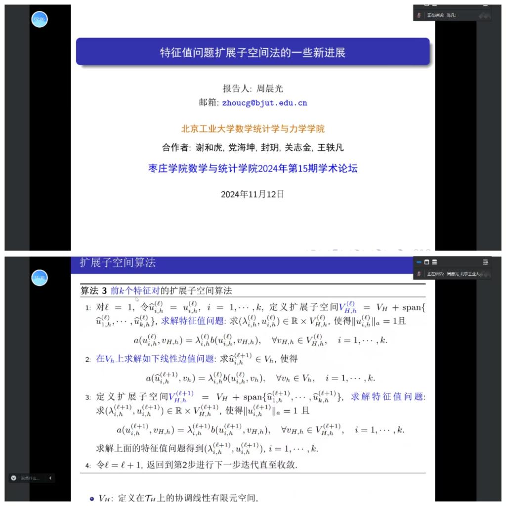 11月12日,bat365中文官方网站举办学术论坛,学院邀请了北京工业大学周晨光博士做了题为《特征值问题扩展子空间法的新进展》的学术报告。