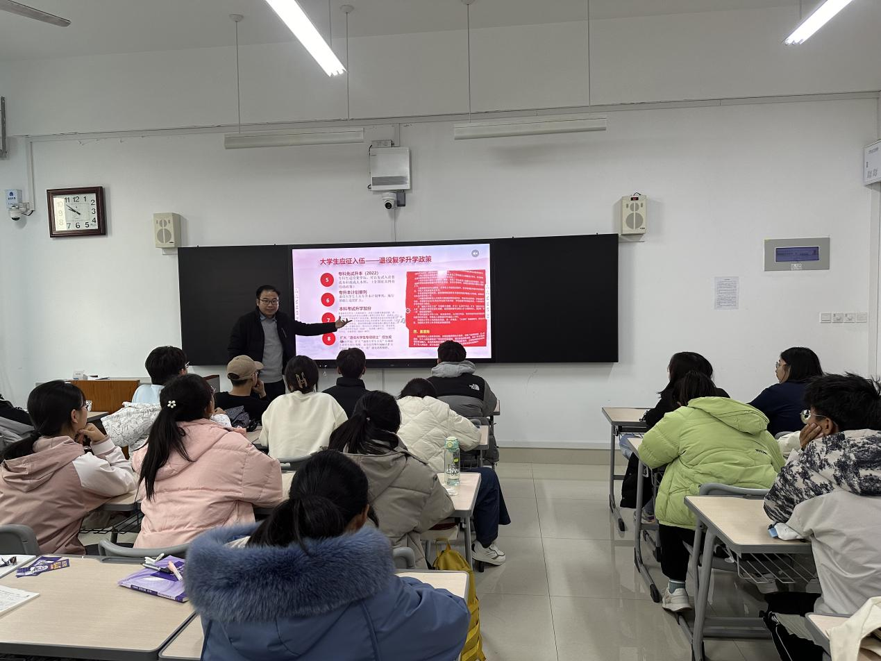 为进一步激发学生们参军报国的激情,鼓励学生们积极参与征兵,营造良好的征兵氛围,同时帮学生们更全面的了解征兵相关政策,bat365官网于2023年12月4日下午在增信楼514室举行2024年上半年征兵政策宣讲会。