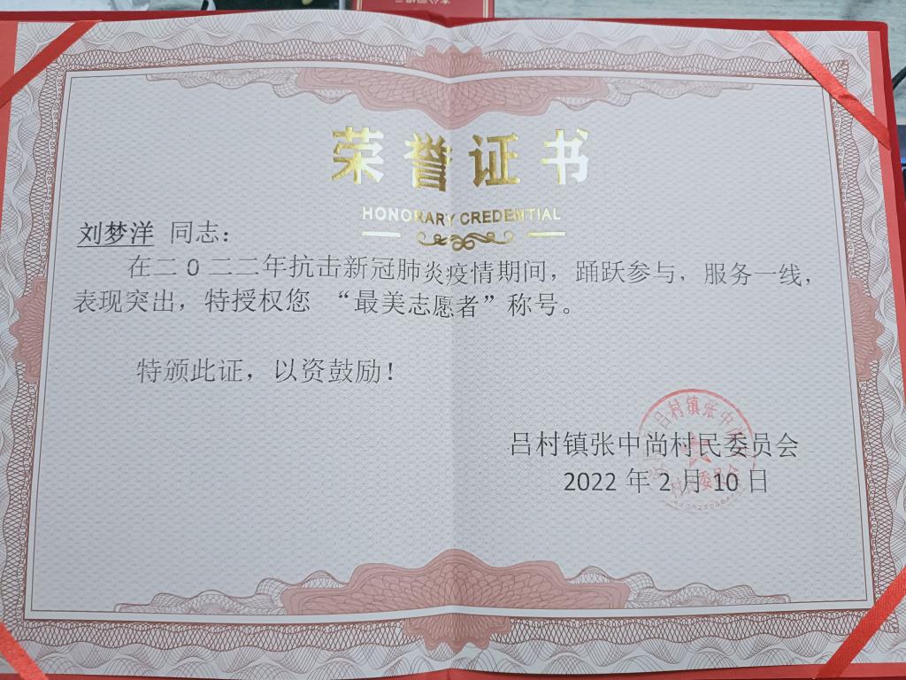作为新时代青年大学生,刘梦洋同学用自己的行动践行着当代青年的使命。他加入了家乡安阳县大学生志愿者联盟,积极响应政府号召,多次参与当地志愿者活动,在行动中诠释青春诺言。2021年年末,突如其来的疫情席卷河南安阳,疫情就是命令,防控就是责任,刘梦洋和青年志愿者们一起戴上口罩,穿上红马甲,积极投入家乡的疫情防控工作中,用手机给居民录入信息,引导群众按流程和要求进行测温验码、消毒登记、引导返乡人员和外来人员进行信息登记、宣传防疫知识。以自身良好形象和模范行动,在平凡的岗位上用不平凡的奉献传递抗疫正能量,为打赢疫情防控阻击战贡献青春力量,彰显了青年大学生的责任担当。