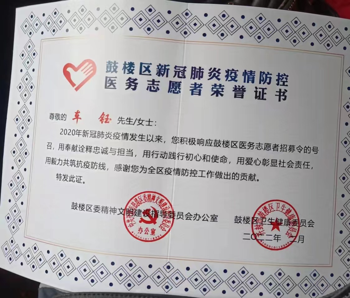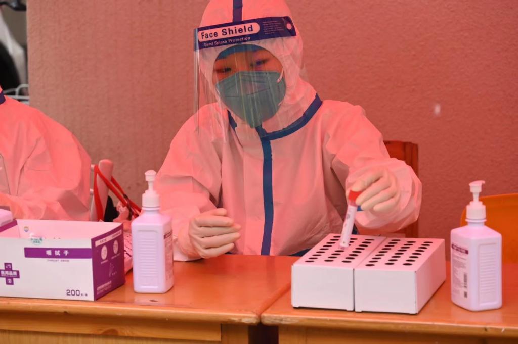 “疫情就是命令,防控就是责任,作为刚返乡的大学生,有义不容辞的责任,在关键时刻要站得出来、顶得上去、冲锋在前。”车钰同学通过身为医生的母亲与鼓楼区卫生部门对接联系并前往社区报道。经过简短的专业培训,她跟随母亲以及其他几位志愿者迅速投入紧张的核酸样本采集工作中,小区设置核酸检测站点,对于不方便出行的老人,他们还会进行上门采集,每天七点准时到岗,在检测位点一坐就是一上午,她协助医护人员进行核酸样本的采集、清点核对样本数量,在这次志愿活动中,她学到了许多医疗知识。