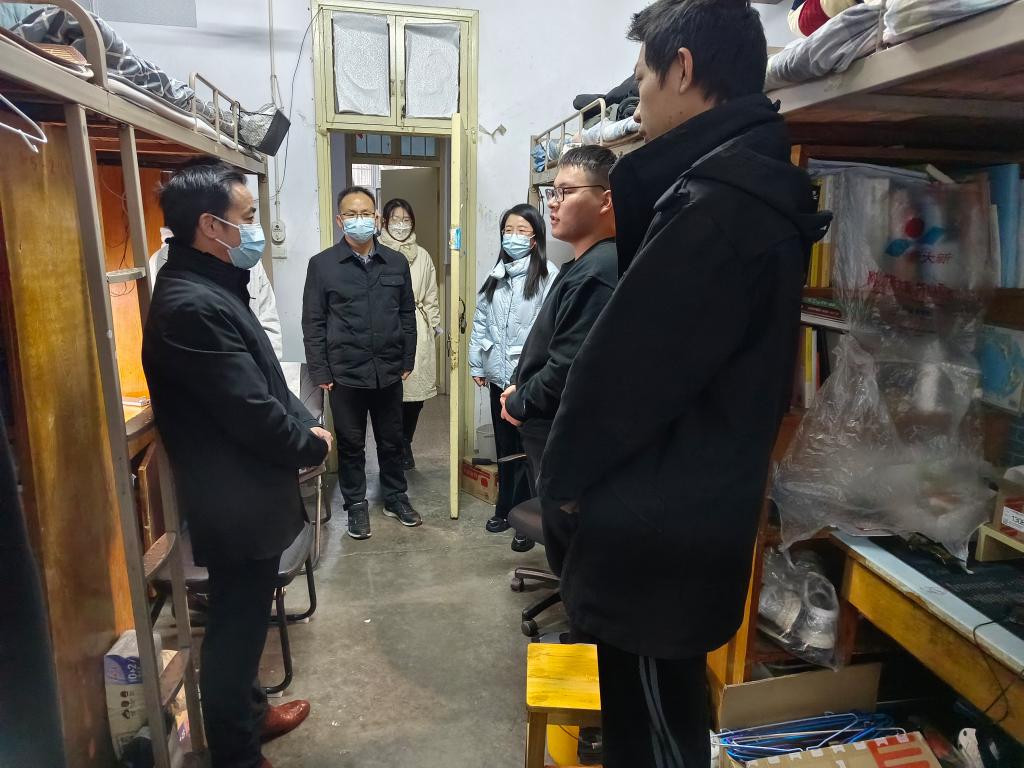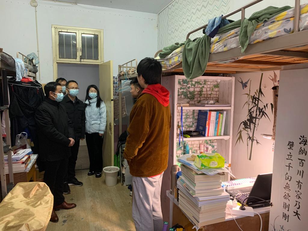 为细化落实《关于做好学生安全有序离校返乡工作的通知》文件精神,深入了解学生思想动态,加强人文关怀和心理健康疏导,帮助学生及时解决实际困难,11月29日下午,beat365官方网站党委书记李舟、副书记付春锋带领辅导员、班主任深入学生宿舍进行走访慰问。