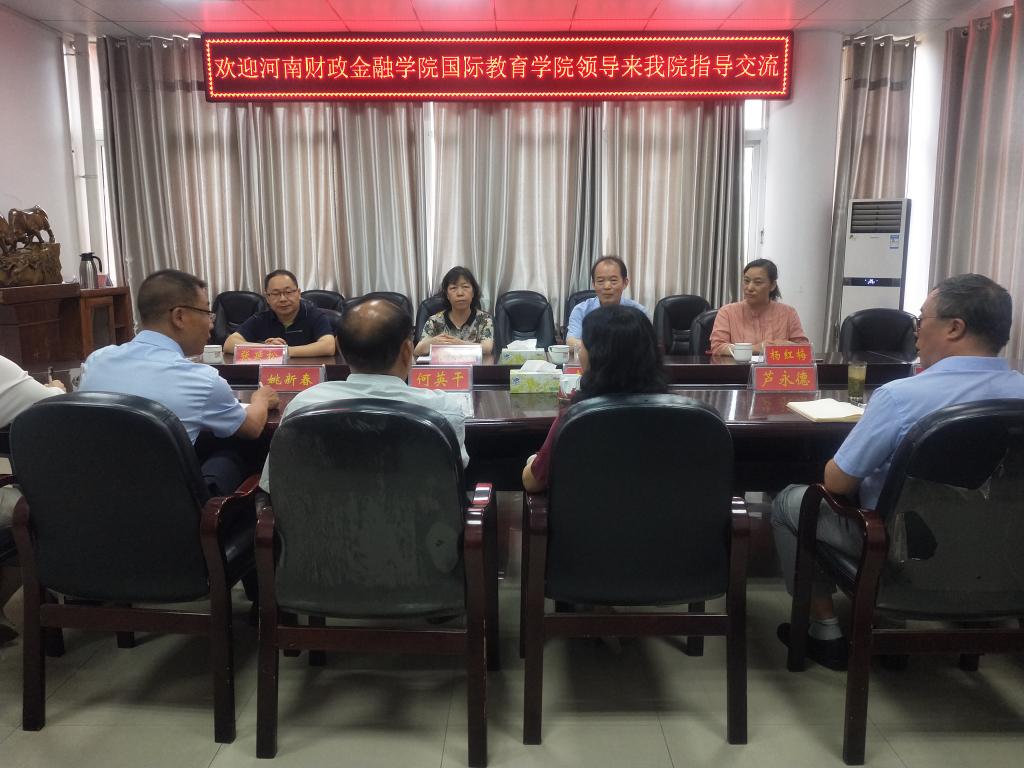 李保红对袁新品、杜明甫一行的到来表示欢迎,并简要介绍了学院的办学情况。何英干就项目申报与建设、项目学生出国留学等工作作了简单介绍。芦永德就中外合作办学教学模式、交流管理等进行了交流。姚新春介绍了beat365中外合作办学党建工作及学生日常管理的经验做法。杜明甫介绍了河南财政金融学院beat365官方网站中外合作办学的现状。双方围绕学科建设、品牌创建、教师交流、学生留学等问题进行了深入的交流和讨论。