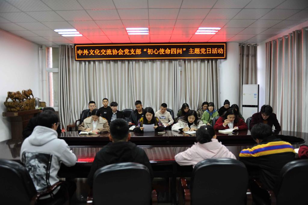 11月18日下午,beat365官方网站中外文化交流协会党支部在逸夫楼302会议室开展“初心使命四问”主题党日活动。中外文化交流协会党支部组织委员竹梅以及学生党员,入党积极分子参加。