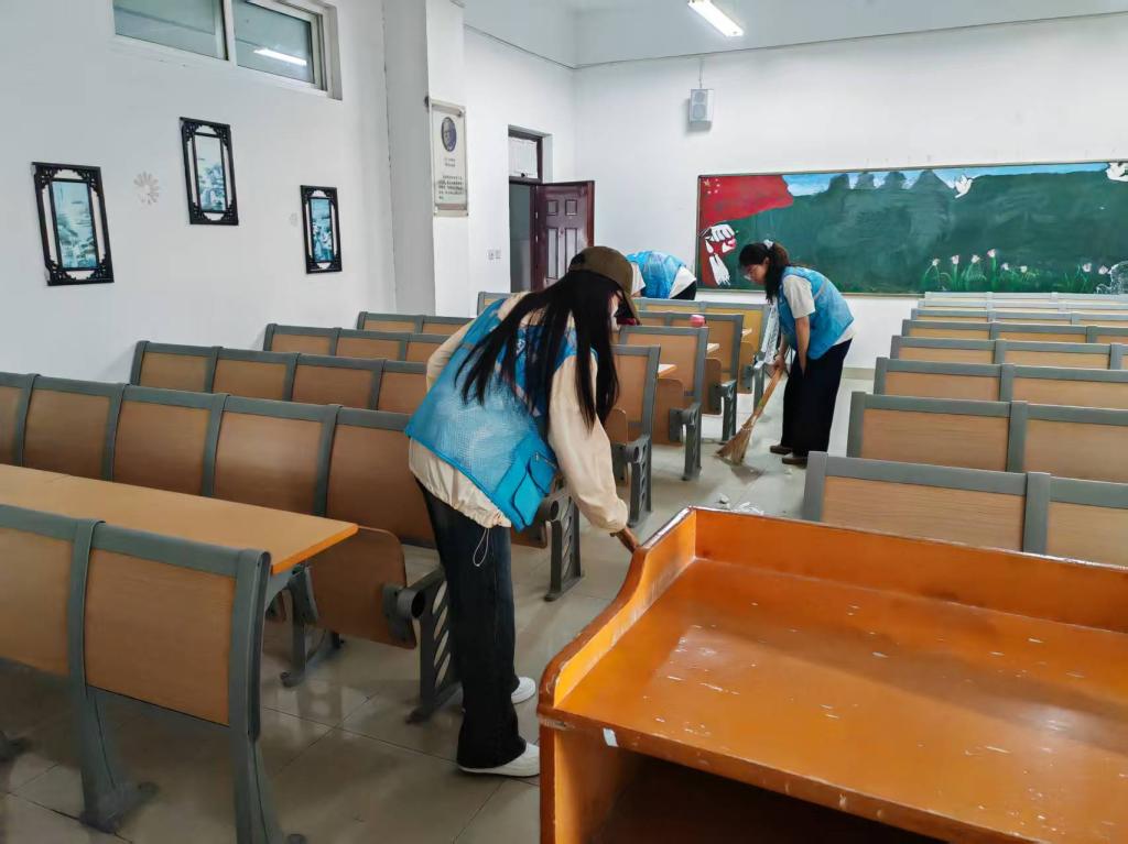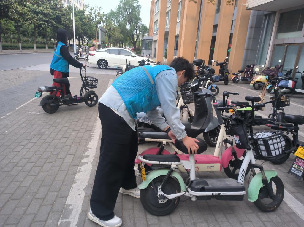 活动伊始,党员发展对象们迅速行动,分工协作开展教室清洁工作。他们手持扫帚、抹布等工具,认真清扫地面灰尘、擦拭黑板桌椅,清理垃圾桶,不放过任何卫生死角。完成教室清洁后,大家又投身到逸夫楼前电动车整理工作中,将随意停放的电动车一一挪至指定区域,并摆放整齐。同时,积极向路过师生宣传规范停车的重要性,引导共同维护校园秩序。